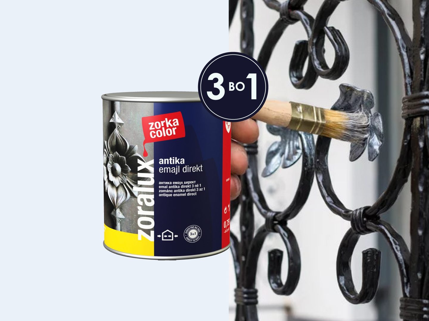 Ви го претставуваме специјалниот премаз на Зорка колор – ЗОРАЛУКС Антика емајл директ (3во1). Овој производ може да се нанесува директно на метал, на претходно исчистена површина (со шмиргла или челична четка) без користење на антирост и основна боја (миниум) со што заштедувате средства за купување на дополнителни 2 производи (околу 350 денари). Зоралукс антика директ се препорачува за заштита на надворешни и внатрешни метални површини, а посебно е погоден за заштита на огради, влезни порти и украсни елементи од ковано железо. По нанесување металните површини добиваат рустичен сјај – изглед на антика.